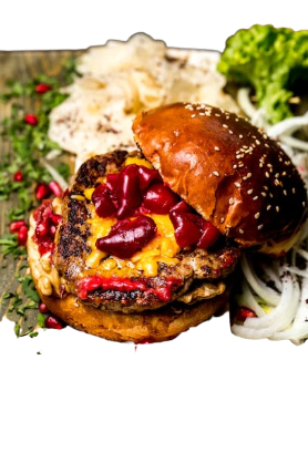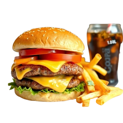 Smashed 140g Rindfleisch mit Brioche-Brötchen, Cheddarkäse, Scharfe Soße , Pommes frites und alkoholfreies Getränk 0,33l serviert