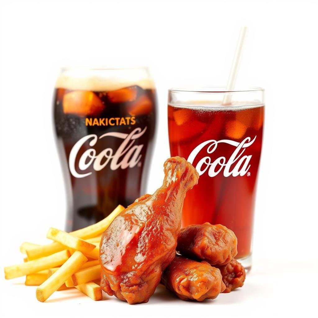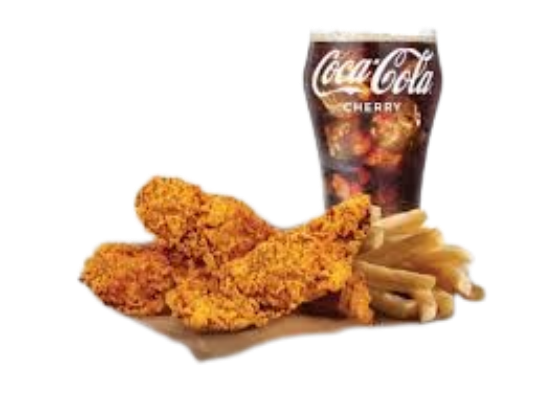 8 Stück saftige Hähnchenstreifen , mit Pommes frites und alkoholfreies Getränk 0,33l serviert