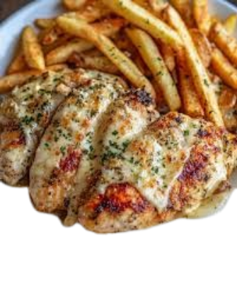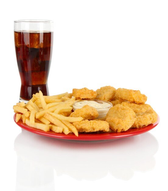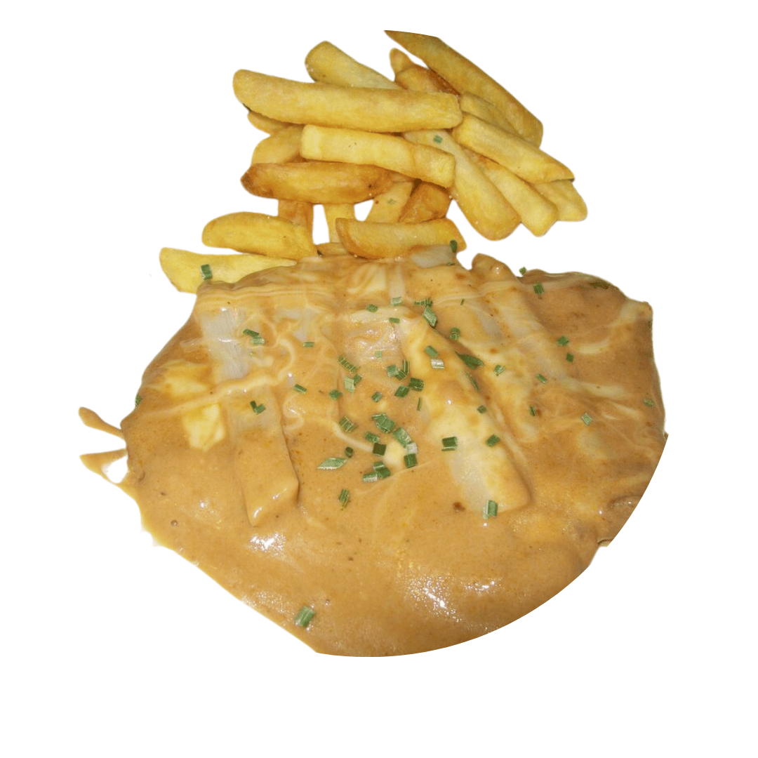 Hähnchen auf knusprigen Pommes, überzogen mit Käsesauce , mit Pommes frites und alkoholfreies Getränk 0,33l serviert