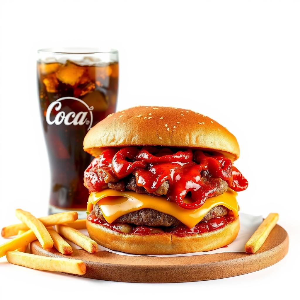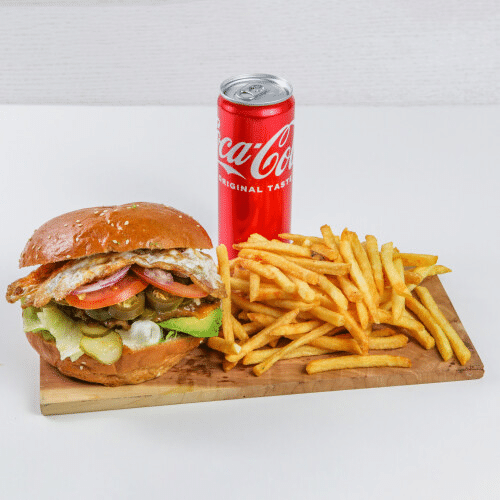 Smashed 140g Rindfleisch, Brioche-Brötchen, Rindfleisch Beef Bacon , Pommes frites und alkoholfreies Getränk 0,33l serviert