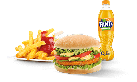 135g Crispy Chicken mit Brioche-Brötchen , Pommes frites und alkoholfreies Getränk 0,33l serviert