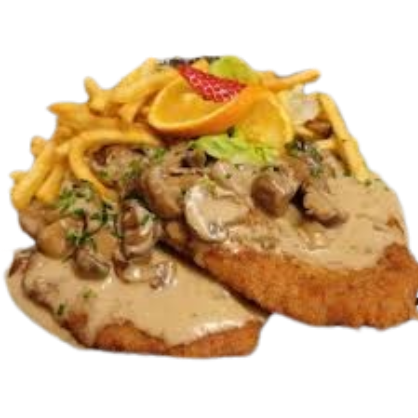 mit Pfifferlingen, Champignons und Rahmsauce,inkl. Beilagensalat und Beilage nach Wahl