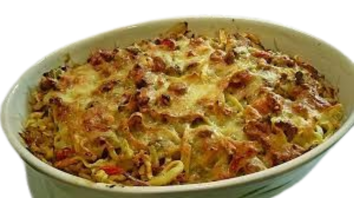 mit Gemüse, Sahnesoße und Käse überbacken