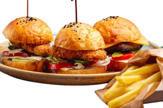 Smashed 140g Rindfleisch, Brioche-Brötchen und Cheddarkäse , Pommes frites und alkoholfreies Getränk 0,33l serviert