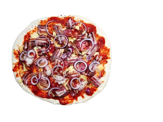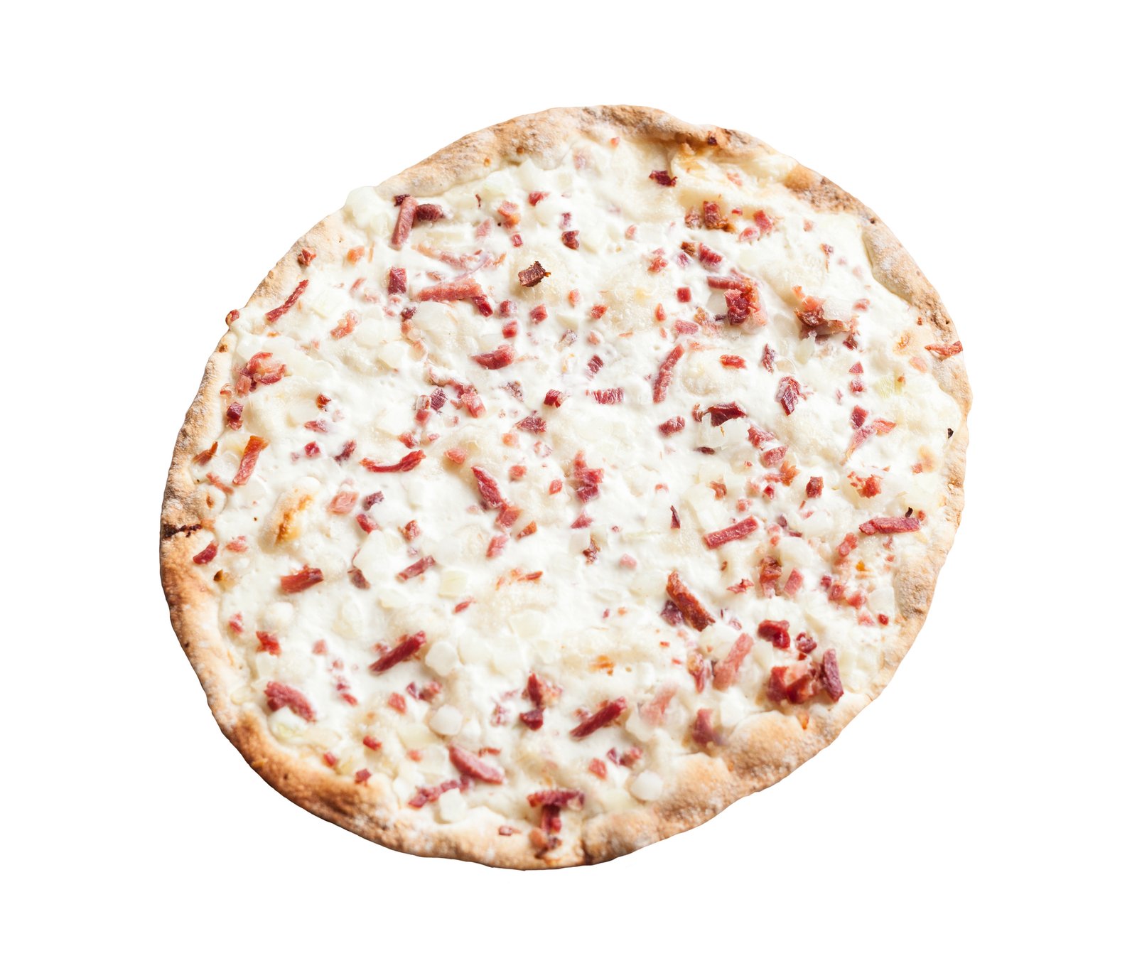 mit Flammkuchensoße, Schinken, Rindspeck und Zwiebeln