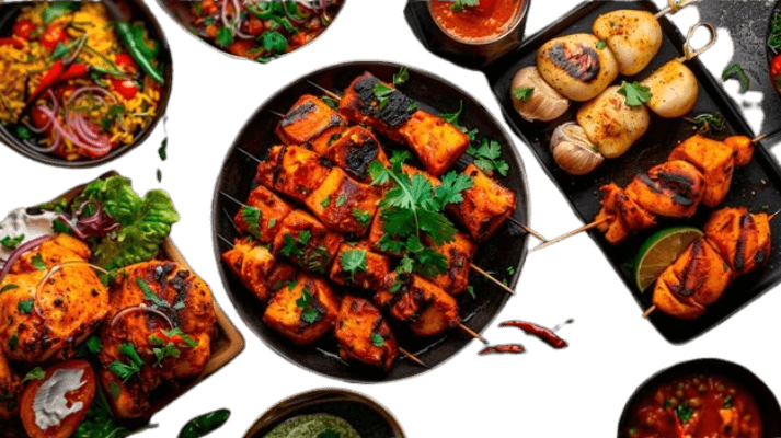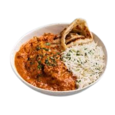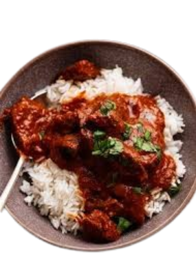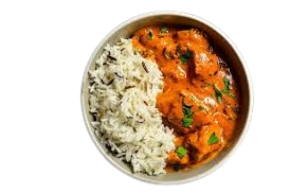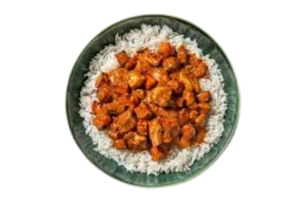 Gegrillte Hähnchenstücke mit Tomate in Masalasoße mit Reis serviert.