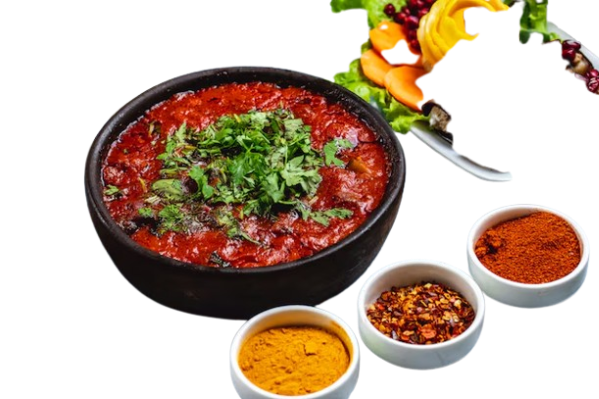 Lammfleisch mit klein geschnittenen Paprika, Tomaten, Zwiebeln und grünen Chilistreifen in sehr scharfer Soßemit Reis serviert.