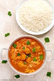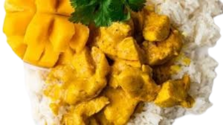 Hühnereischstücke in cremiger Kokossoße mit Reis serviert.