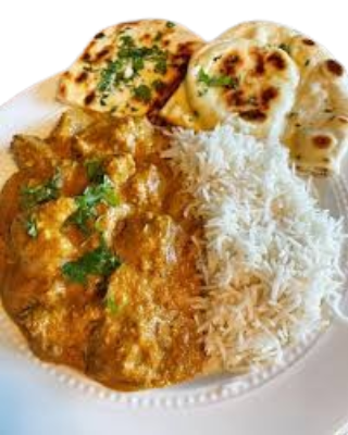 Lamm in einer milden, cremigen Cashew-Mandel-Soße mit Reis serviert.