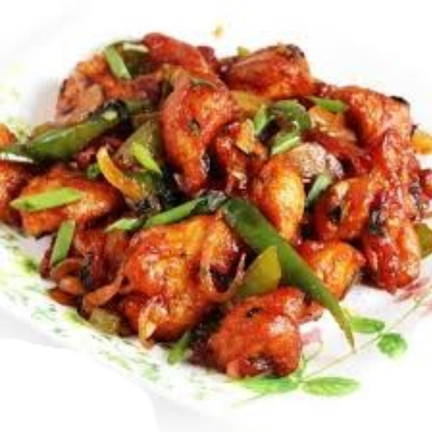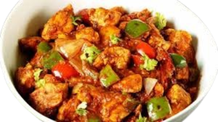 Hähnchenbrust gebraten mit Paprika, Zwiebeln, grünen Chilistreifen und sehr scharfer Soße mit Reis serviert.