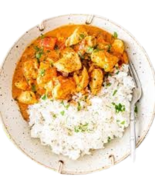Hähnchen in einer cremigen Tomaten-Butter-Soße mit Reis serviert.